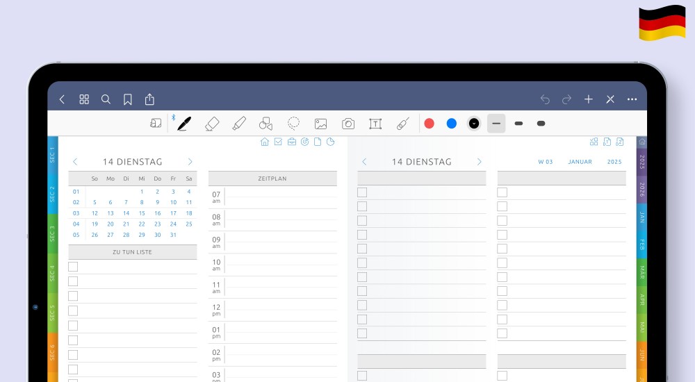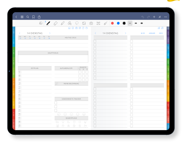 📈 Optimierte Wochenplanung – Planen Sie Ihre Wochen präzise mit 5- und 7-Tage-Layouts, Wochenroutinen, Zielen und einem Einnahmen-/Ausgaben-Tracker. So rücken Sie Woche für Woche Ihren Zielen näher.