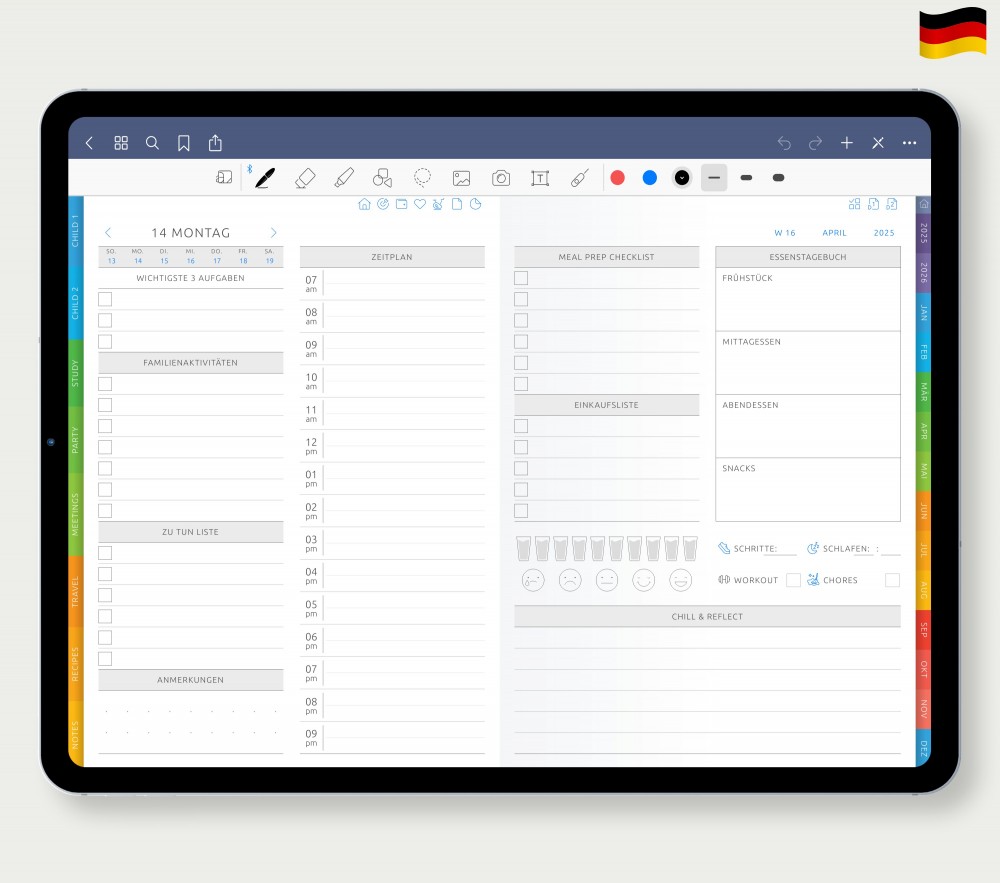 📖 Exklusive Homeschooling-Ressourcen entdecken: Verwalten Sie den Hausunterricht nahtlos mit zwei zusätzlichen, frei anpassbaren Tagesseiten – inklusive „Täglicher Unterrichtsplan“ und „Tägliches Linienraster“. Nutzen Sie außerdem den neuen Family Study Hub als zentralen Bereich für eine klar strukturierte Organisation.