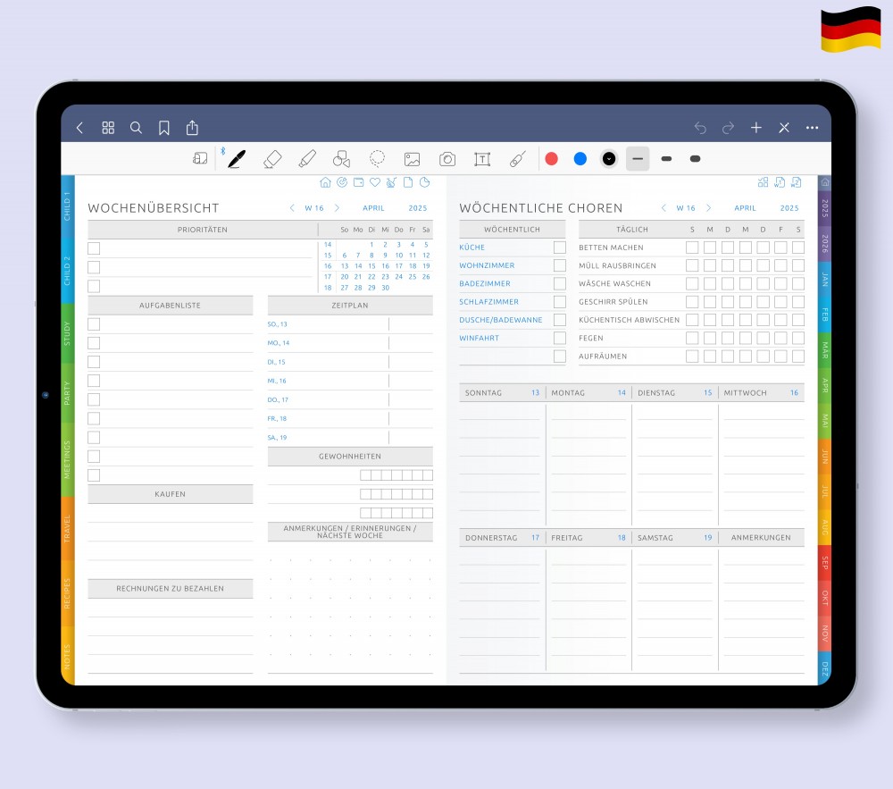 🗓️ Wochenplan individuell gestalten: Wählen Sie aus über 60 flexiblen Layouts, darunter die Seite „Wöchentliche Aufgaben“. Halten Sie tägliche und wöchentliche To-Dos fest, verknüpfen Sie diese mit detaillierten Reinigungs-Checklisten und nutzen Sie zahlreiche Vorlagen für eine klare Wochenstruktur.