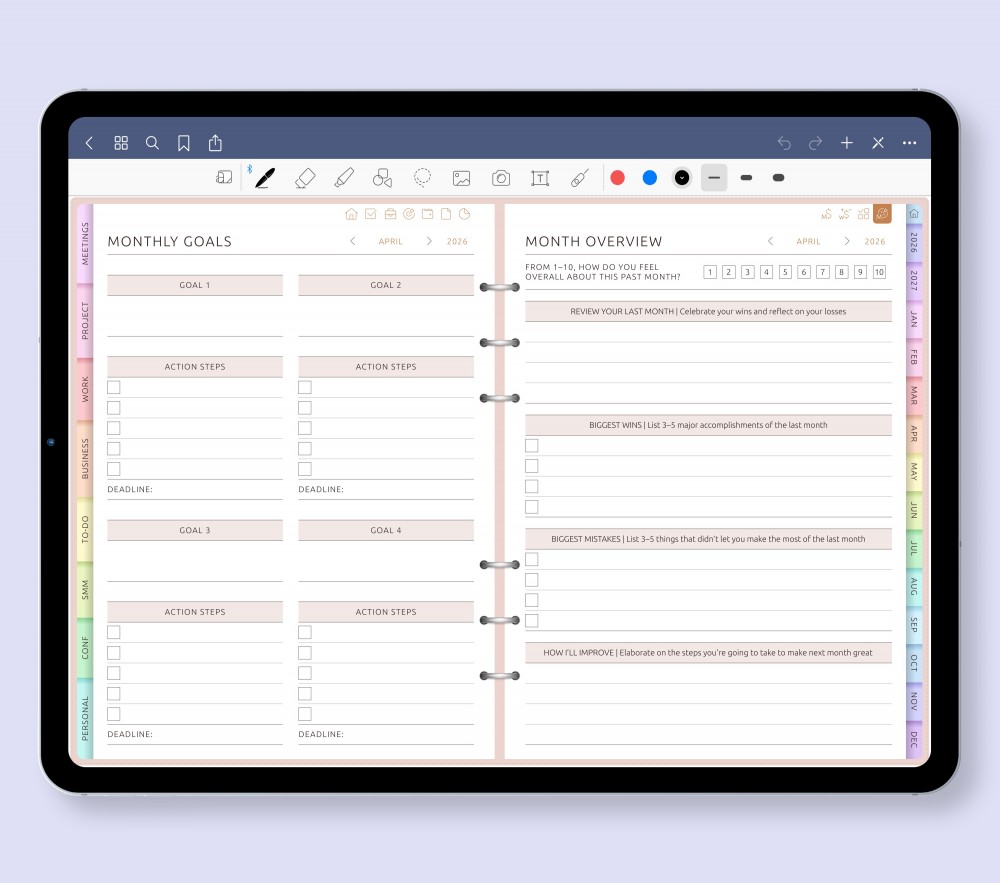Get organized, stay productive, and feel in control of your schedule with this beautifully designed digital planner for iPad and Android tablets. Fully compatible with Goodnotes, Notability, Xodo, and other note-taking apps, it combines customization, structure, and creative flexibility in one clean, modern layout.