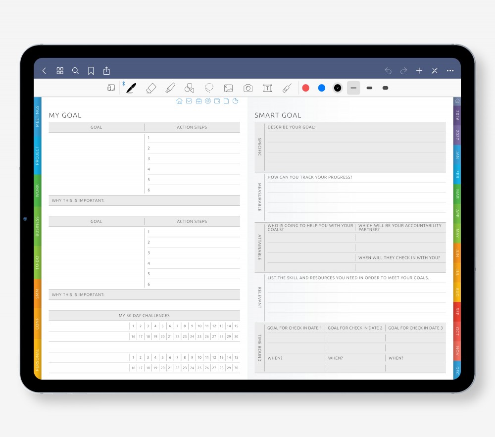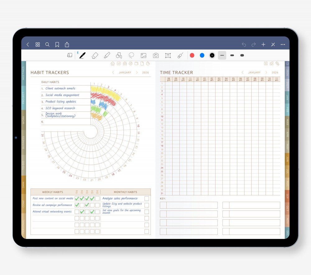 Boost focus and track habits with practical tools: SMART Goal pages, Habit Trackers, Pomodoro layouts, Time Trackers, and more — all designed to help you stay motivated.