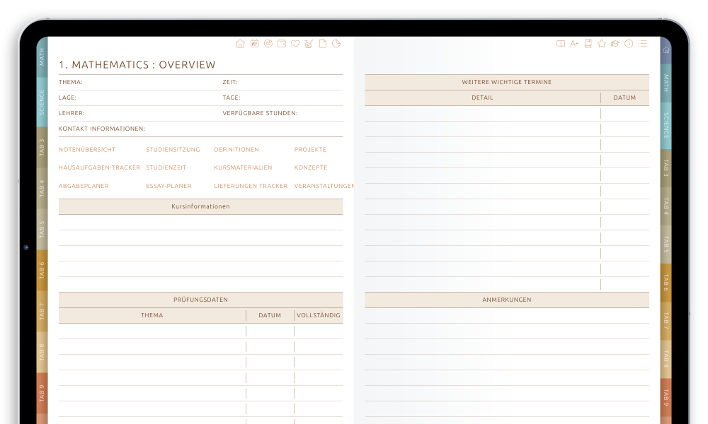 Vertiefen Sie sich in jedes Fach mit unserem Bereich für 10 individuelle Kurse. Jeder Kurs bietet ein umfassendes Layout mit Kursübersicht, Noten-Tracker, Hausaufgabenprotokoll, Lernzeiten und Lernsitzungen. Mit 20 Einheiten pro Kurs und zwei anpassbaren Notizseiten pro Einheit war es noch nie so einfach, detaillierte Informationen festzuhalten.