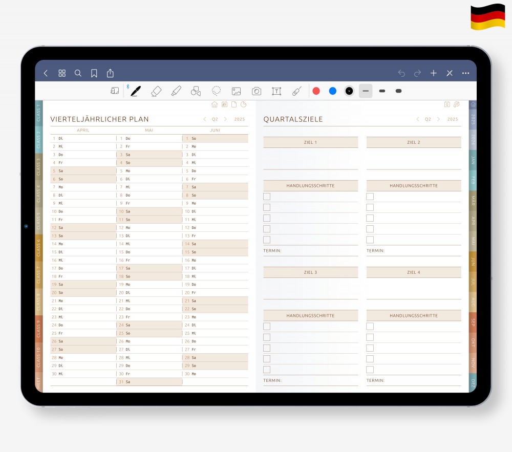Teilen Sie Ihr Schuljahr in überschaubare Quartale und nutzen Sie Layouts, die Sie bei der Zielsetzung, Fortschrittskontrolle und Reflexion unterstützen. Starten Sie mit den Standardseiten oder passen Sie Ihre Quartalsplanung mit über 40 flexiblen Vorlagen an – abgestimmt auf Ihre schulischen Anforderungen.