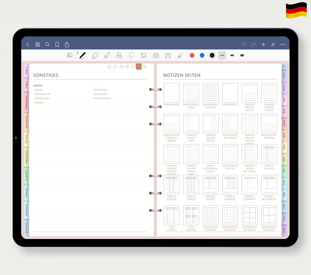 Für alles Weitere gibt es eigene Vorlagen: Kontakte, Passwörter, Leselogs und mehr. Halten Sie zudem Ihre Gedanken mit 30 vielseitigen Notizlayouts fest – perfekt für Journaling, Brainstorming oder Planung. So bleibt alles an einem Ort und übersichtlich organisiert.